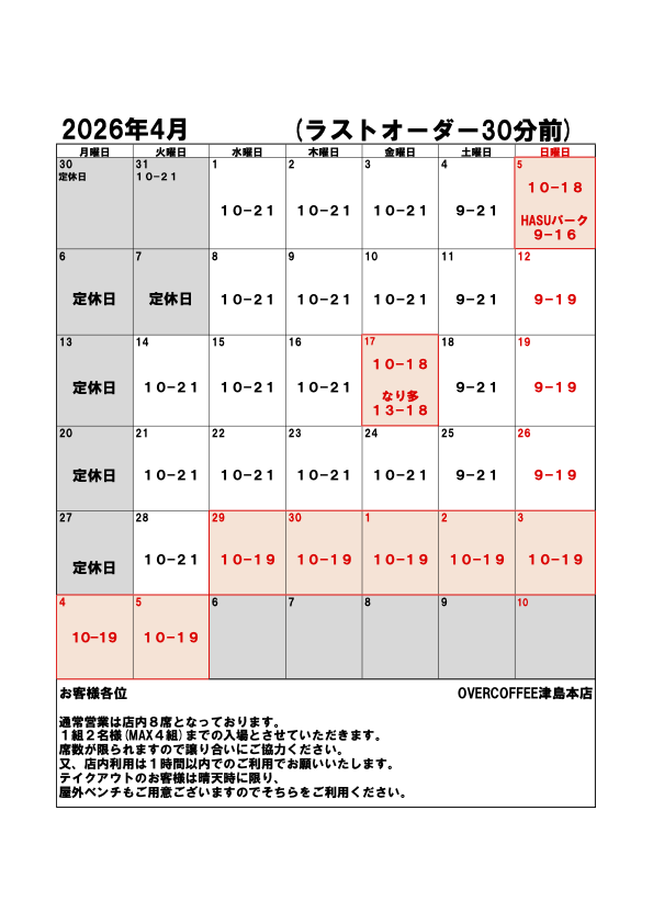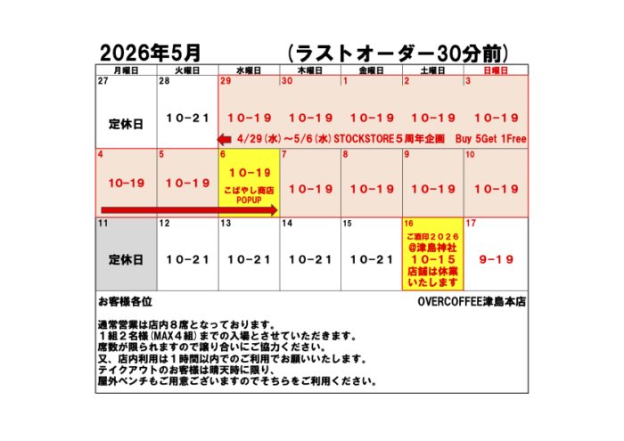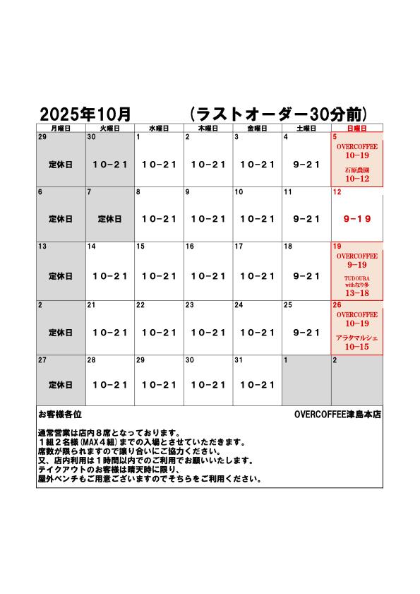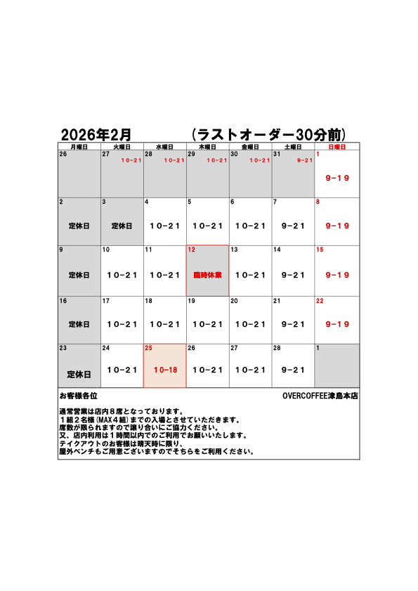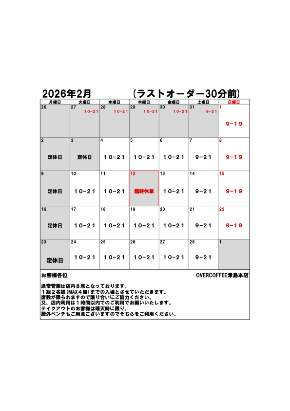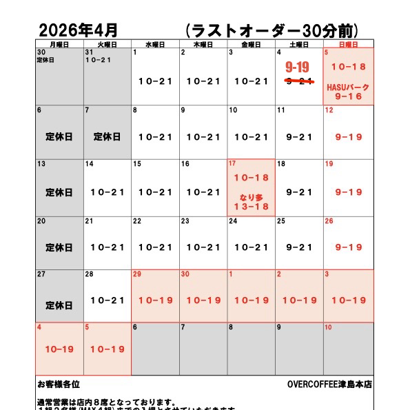 OVERCOFFEE(津島店)では横並びのカウンター席のみの為、イートインは1組2名様まで(全8席,MAX4組)の営業となりますので、3名様以上の場合、テイクアウトにてお願いいたします。