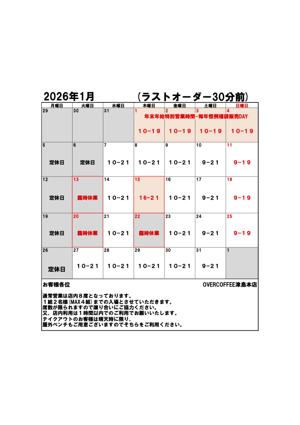 また各店とも『年末年始は変則的な営業となりますので、営業カレンダーにて確認いただきますよう、お願いいたします。』
